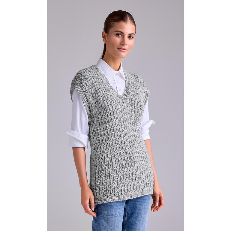 Strick-N 5,0-6,0; für die Passe: Rundstrick-N in der gleichen Stärke, Länge 100 cm: für den Kragen: Rundstrick-N 4,0-5,0, Länge 40 cm.